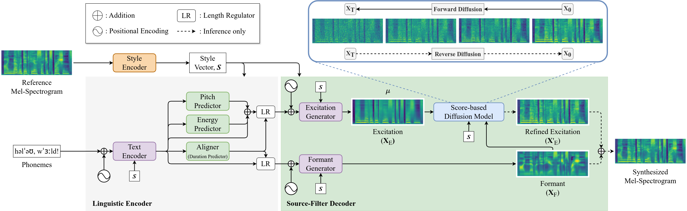 Overall architecture of StableForm-TTS. For brevity, the phoneme, pitch, and energy embedding layers are omitted.